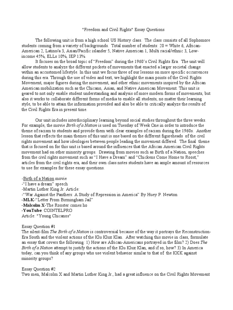 · The civil rights movement refers typically to the right that an individual possesses, mostly the 13th and 14th amendments. The civil rights movement is one of the most vital parts of the United States and worldwide. This demonstrated the cruelty and unfairness of discrimination, and it won’t be endured anywhere in the blogger.comted Reading Time: 7 mins · Essay on Civil Rights. The development of the Civil Rights Movement in the s – s contributed to the consistent transformation of the US society through the elimination of inequality in basic human rights between white Americans and African Americans as well as other racial minorities. In this regard, Rosa Parks protest and desegregation, 4/5(9) Essays on Civil Rights. A review of American history without the mention of the Civil Rights Movement would be considered historically negligent. The events of the Civil Rights offer a significant contribution to the development of America over the years. Essays on Civil Rights are hence common and a considerable part of the education system